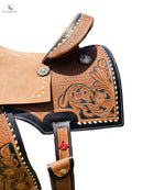 Resistance Rough Out Hard Seat Barrel Style Saddle With Floral Tooled Leather Square Skirt and Fenders - 14, 15, 16 Inch
