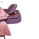 This saddle is accented with floral and basket weave tooling on top skirts, fenders, pommel, and cantle. Bottom skirts and jockeys are accented with a tooled border. Brown suede half-breed seat. This saddle comes equipped with latigo and an off-billet.