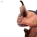 Our Pony saddle, accented with floral and basket weave tooling on skirts, fenders, pommel and cantle along with buck stitching . This saddle is for the rider who wants comfort but also a thoughtfully designed saddle. It comes equipped with leather latigo and off billet to give your horse a secure fit.