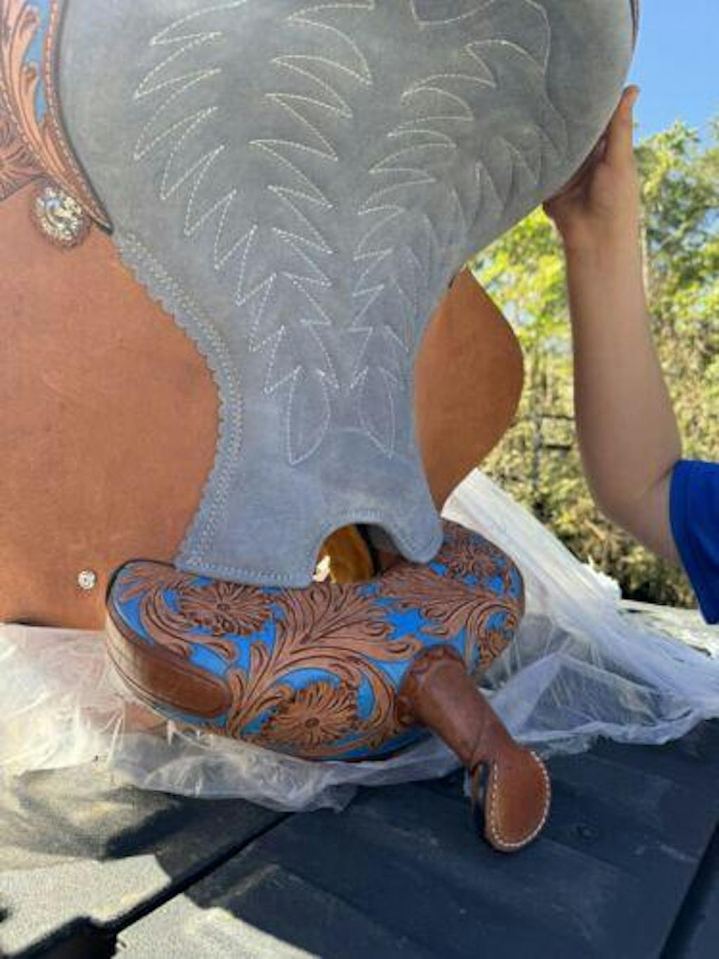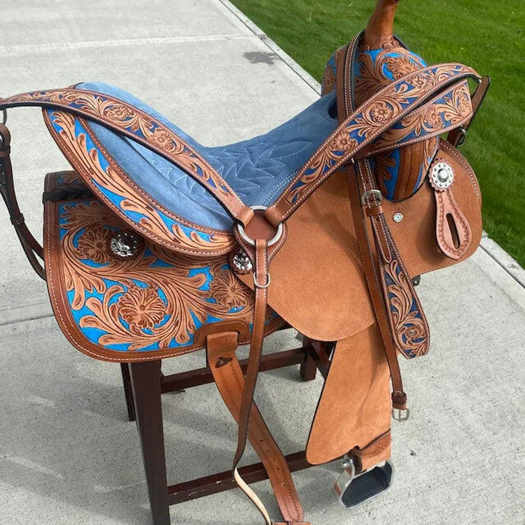 Immerse yourself in luxury with our 100% leather saddle in a natural color. Adorned with exquisite floral tooling, it showcases timeless beauty. The addition of silver Conchos adds a touch of elegance and sophistication. Enjoy optimal comfort with a cantle and a plush suede seat. Indulge in the finest craftsmanship and elevate your riding experience with this premium saddle.
