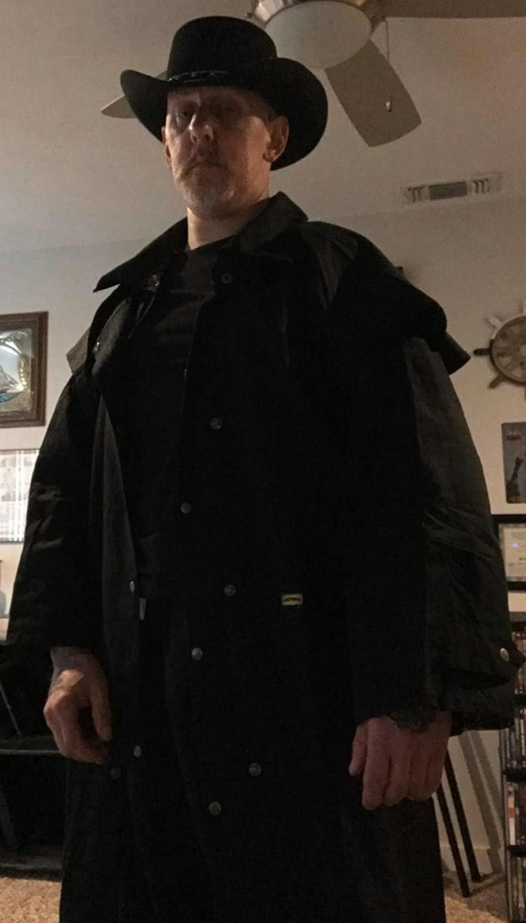 - WESTERN STYLE COAT - This Oilskin Duster from Resistance Company features a caped Australian style that also encompasses the look of the Wild West and is definitely a symbol of the western cowboy