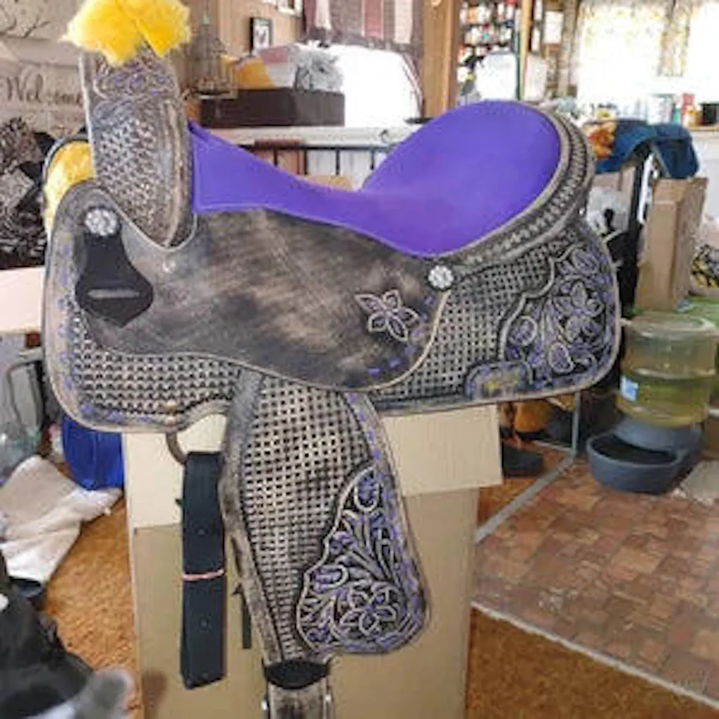 This Western horse antique barrel saddle is made of leather and comes in sizes 14", 15", 16", 17", and 18". It is a classic style saddle with a deep seat and high cantle, designed for a secure and comfortable ride. The saddle also comes with a matching tack set, including reins, breastplate, and a bit. The antique finish gives the saddle a vintage, rustic look that is perfect for riders who prefer a traditional western style. The leather is durable and will age beautifully over time, making this saddle a great investment for any rider.