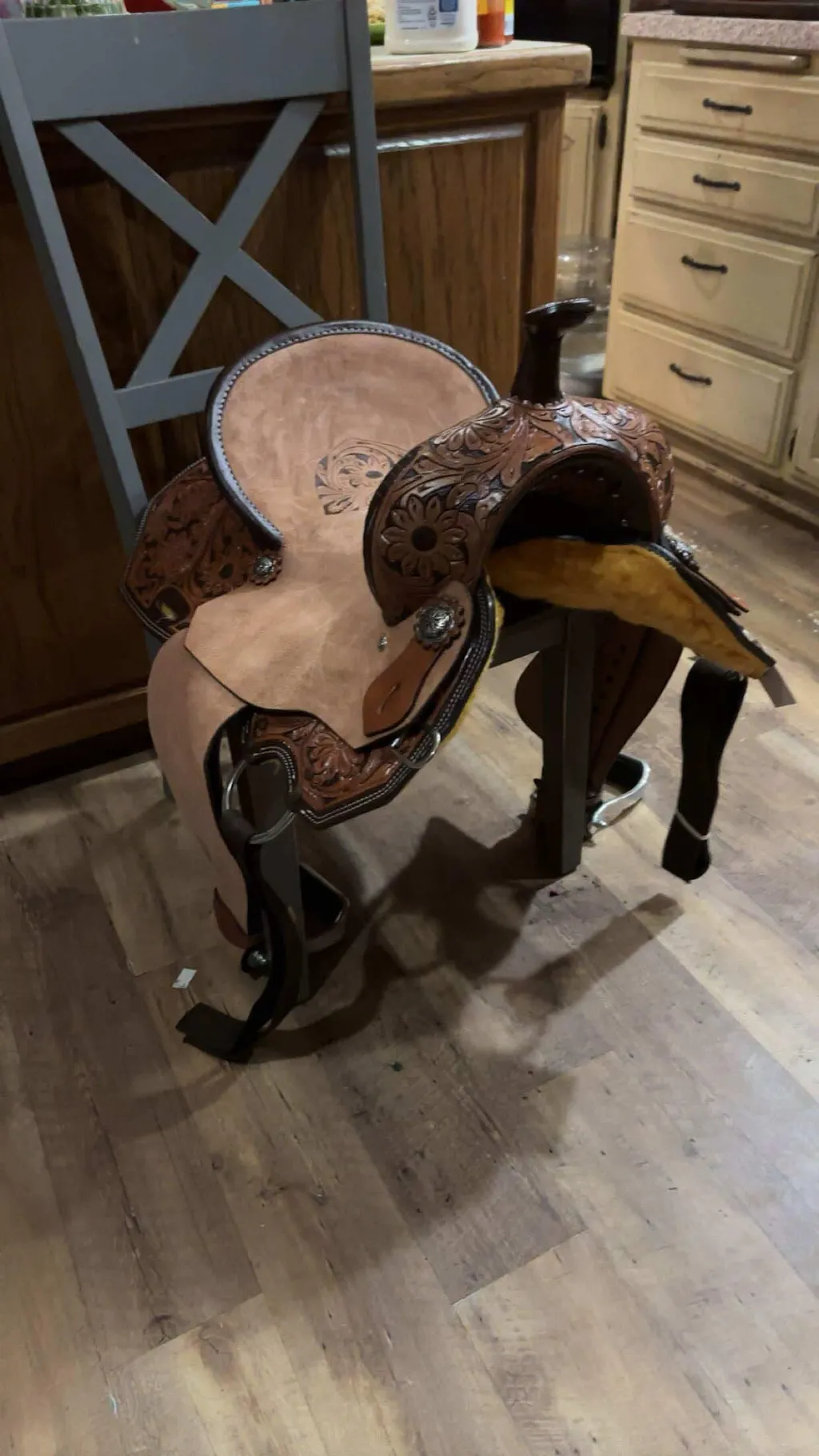 My daughter was over the top in love with this saddle when it came in! Amazing quality, and absolutely beautiful tooled leather! Definitely worth the money! So happy with our purchase!!