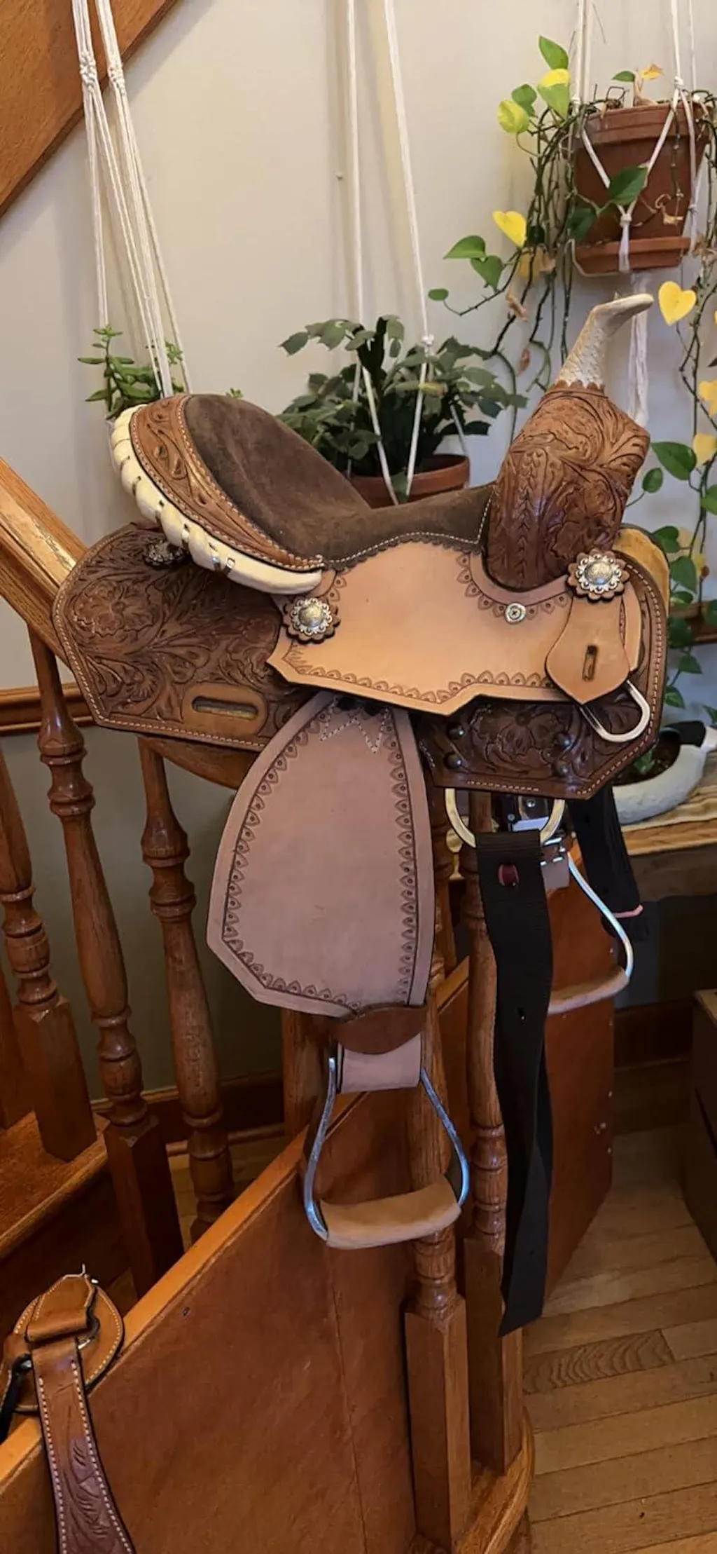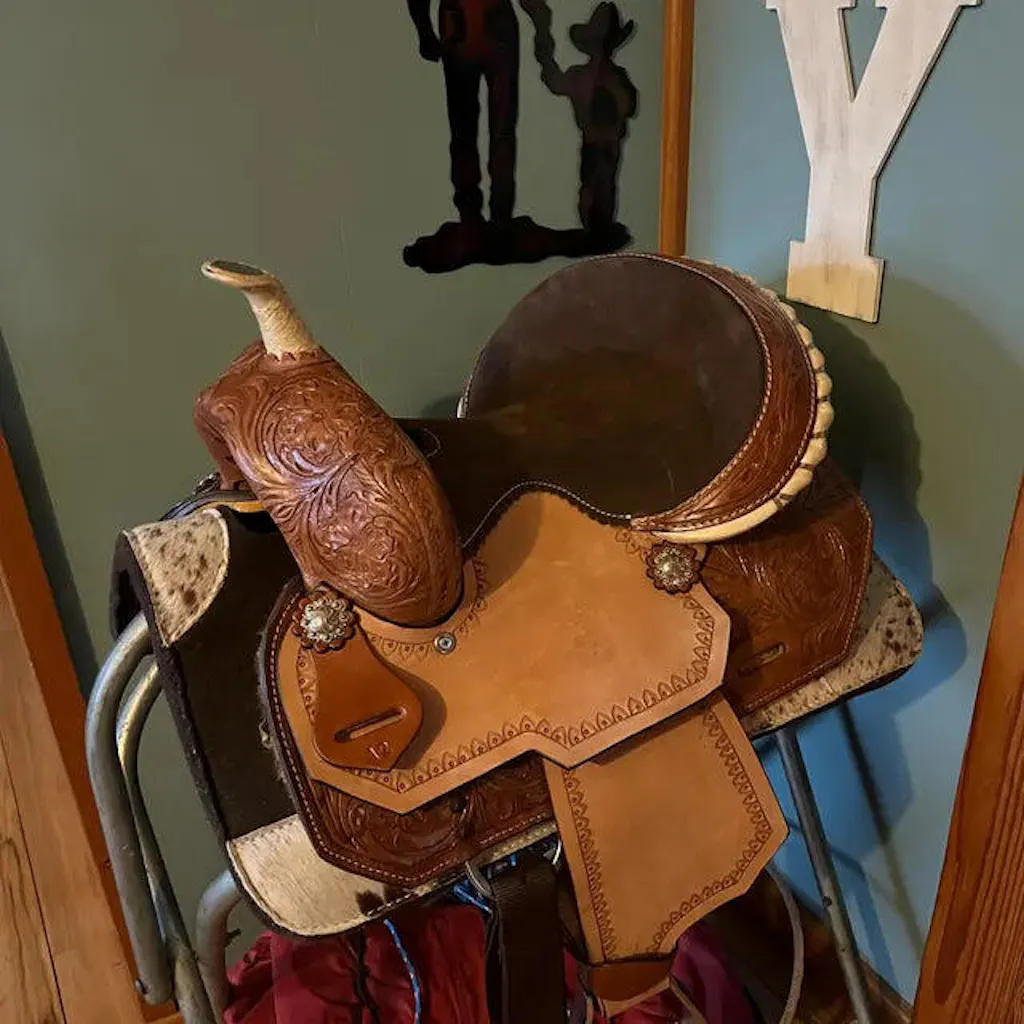 The young rider’s saddle was created to retain its rich leather and handsome look while being used by today’s youth. The Rough out hard seat and Fender with serpentine tooling throughout. long saddle stripes blend together with the bell stirrup with leather tread, double skirt with basket weave tooling to create a saddle that is functional without sacrificing style.